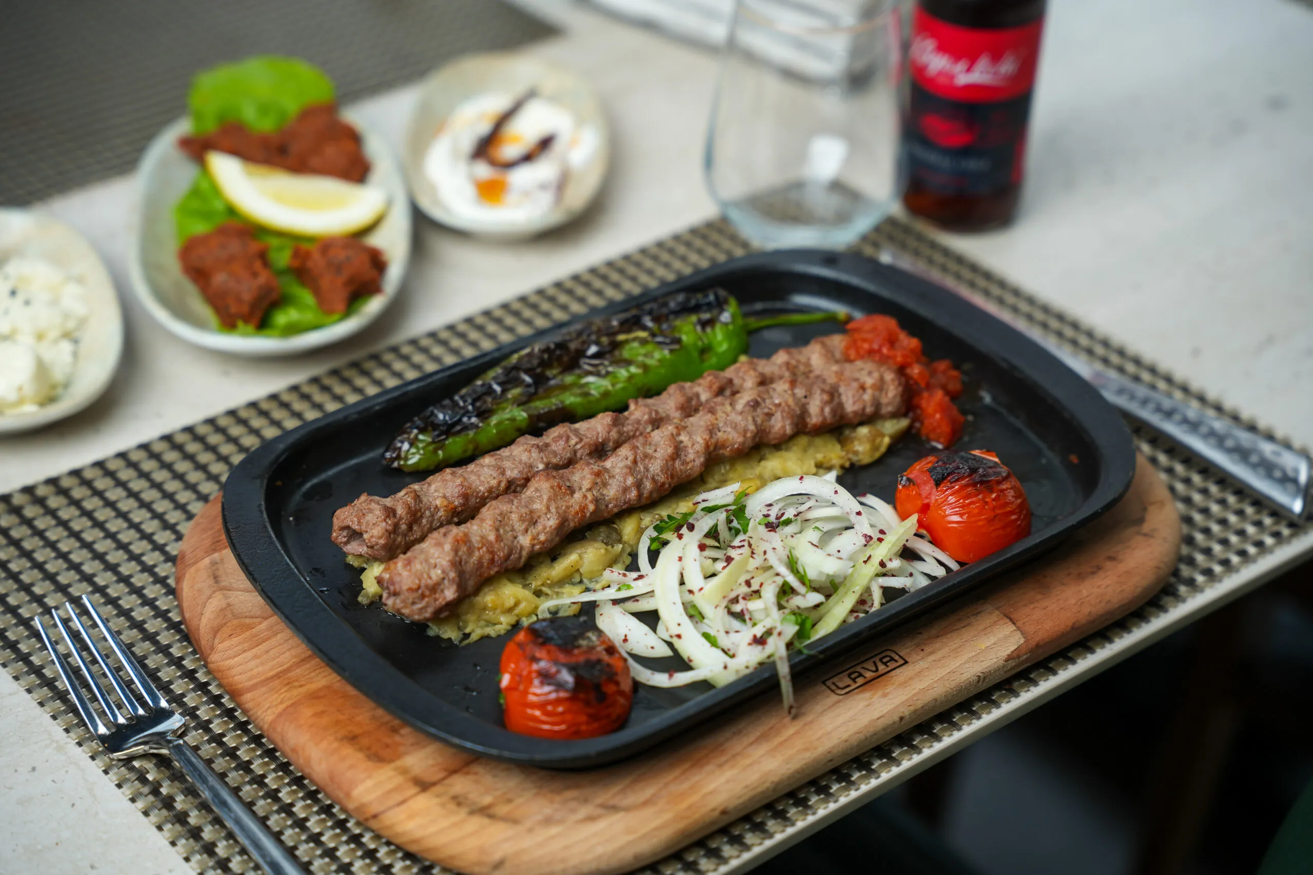 Kuzu etinden satır kıyma, közlenmiş patlıcan, közlenmiş domates sosu, tereyağı.